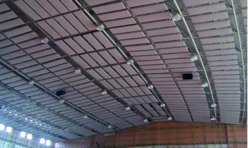 3、吸聲體安裝:吸聲體安裝在懸掛件安裝焊接就位后,用U型環懸掛,馬道上的吸聲體用鐵絲綁扎,要求排列有規律,與水平面垂直,整體美觀。吸聲體安裝時要防止尖銳器具刺破,影響吸音及美觀效果。